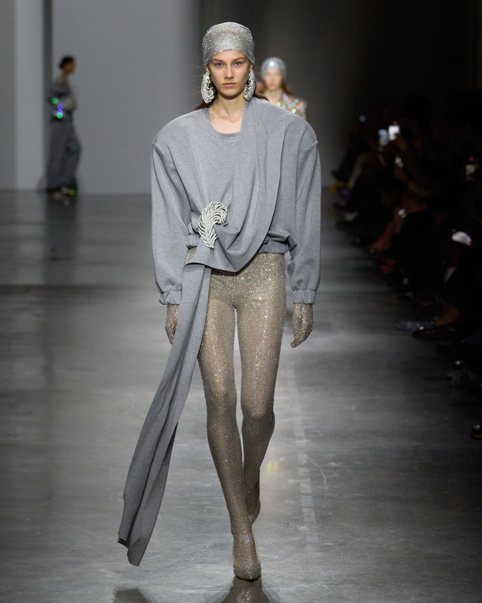 Di Morabito’s style emphasizes feminine, alluring silhouettes, where sensuality is enhanced by precise tailoring and structure. Hidden corsets with boning, crinolines, and molded bra cups embody the timeless techniques of classic corsetry. His pantsuits and blazers are crafted with the principles of traditional masculine tailoring, while trousers remain fluid yet are made from classic men’s fabrics. In contrast to the structured tailoring, the evening dresses and draped corsets radiate a sensual, glamorous allure, often adorned with shimmering crystals—a hallmark of the brand—that add drama and opulence. Classic works of art—by Caravaggio, Artemisia Gentileschi, and Canova—inspire the creation of silhouettes, drapings, necklines, and intricate details, reinterpreted through a modern lens and contemporary sensibility. The iconography of Venus—from Venus Italica and Venus Pudica to Venus de Milo and Botticelli’s Birth of Venus—serves as a visual foundation for Di Morabito’s seductive style. His designs pay homage to the divine power and beauty of femininity, elevating grace and strength through sculptural forms and flowing drapery. His bold, sensual looks have been cherished by a long list of movie stars and celebrities, including Zendaya, Lady Gaga, Kyle Jenner, Cher, Dua Lipa, Rihanna, Jennifer Lopez, Cardi B, Katy Perry, Kourtney Kardashian, Lorde, Kate Hudson, Rita Ora, Olivia Wilde, Emma Roberts, America Ferrera, Jennie Ruby Jane, Megan Fox, Fka Twigs, Anitta, Sabrina Carpenter, Julia Fox, Elodie.